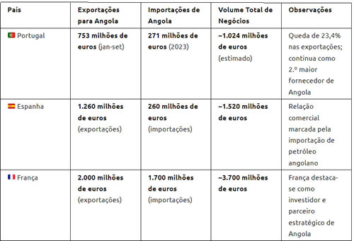 Em 2024, França liderou o volume de negócios com Angola, com cerca de 3700 milhões de euros resultantes de um forte fluxo bilateral de exportações e importações, consolidando-se como investidor e parceiro estratégico incontornável em Angola. Espanha seguiu com um volume total estimado em 1520 milhões de euros, beneficiando sobretudo das importações de petróleo angolano e reforçando o seu papel no comércio energético. Por sua vez, Portugal enfrentou uma queda assinalável nas exportações, registando apenas 753 milhões de euros entre Janeiro e Setembro – uma quebra de 23,4% face ao ano anterior. O volume total de negócios português, estimado em cerca de 1024 milhões de euros, evidencia uma perda de dinâmica comercial. Este declínio acentuado levanta questões sobre a competitividade das empresas portuguesas no mercado angolano e a eficácia das políticas de internacionalização, sobretudo num momento em que outros países europeus estão a fortalecer laços económicos e estratégicos com Angola.