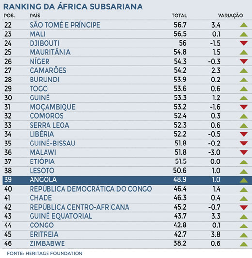 De acordo com ranking da Heritage Foundation, elaborado em parceria com o The Wall Street Journal, em relação às economias africanas, Angola está à frente apenas da República Democrática do Congo (posição 163), Chade (164), República Centro-Africana (168), Guiné-Equatorial (170), Congo-Brazzaville (172), Eritreia (173) e Zimbabwe (175).