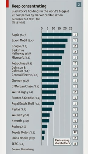O Black Rock não é um banco, é muito mais do que um banco. Administra directamente 4 triliões de dólares de ativos, mais 11 triliões através da sua plataforma, Aladdin. Ou seja, dirige 7% de todos os ativos financeiros mundiais. É o maior accionista de metade das 30 maiores empresas do mundo, como se regista na listagem que segue.