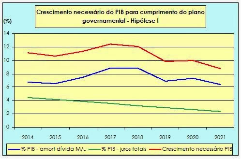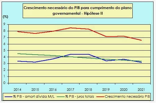 Mesmo com um esforço financeiro muito menor do que a opção contemplada na Hipótese I, o crescimento anual exigido para o PIB, para o cumprimento desse plano (gráfico 3) continuaria a ser muito elevado (entre 6.6 e 8.5%), quedando-se a dívida contabilizada pelo IGCP no final do período, em cerca de € 155000 M. A redução da amortização de capital, com transferências para depois de 2021 – como ensaiado pelo governo em 11 de fevereiro - constitui um alívio mas, é parcialmente compensado pelo aumento dos juros a pagar. Como se observa (gráfico 3), mesmo no quadro de uma dilação de pagamento de dívida para 2022 em diante (cerca de € 50000 M, próximo de ¼ da dívida atual) não é realista que se consigam taxas de crescimento como as aqui obtidas; continuaríamos supondo um cenário de economias como a chinesa ou de alguns países africanos. Esse crescimento é irrealista para mais com uma população em envelhecimento rápido devido ao volume dos chamados “baby boomers” e ao enorme fluxo de saída de jovens, sem oportunidades de trabalho decente em Portugal, onde prepondera um empresariato descapitalizado, viciado em apoios estatais e tão incapaz quanto cúpido e historicamente gerador de subdesenvolvimento.