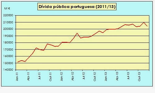 A realidade no período de três anos - 2011/13 - considerados no gráfico 2, evidencia que as novas dívidas preponderaram sobre as amortizações de outras, mais antigas, não sendo muito visíveis os benefícios da omnipotente troika e do indigente governo Passos/Portas, superiormente assessorado e tutelado pelo “sábio” Cavaco.