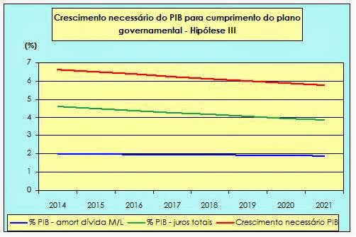 Esta distribuição da dívida de longo prazo por um prazo de 30 anos reduz o esforço a exigir para a sua liquidação, em 2014/21, uma vez que se reduz a amortização ficando os juros com uma pequena variação face à Hipótese II. No entanto, esta terceira simulação, exigiria um crescimento do PIB acima dos 6%, sendo de recordar o seu prolongamento até 2044!