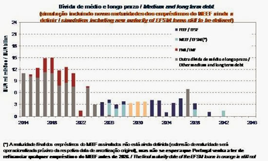 Numa visão de longo prazo, poderá obter-se um reescalonamento da amortização da dívida, aliviando a sua relevância no total dos reembolsos no período 2016/21. Em junho de 2013 o binómio FEEF/MEEF estendeu o prazo de pagamento, de 12.5 para 19.5 anos, com início dos reembolsos a partir de 2025. No que respeita à dívida para com o FMI (€23873 M), cujo reembolso se concentra entre 2015 e 2023, pode encarar-se um reescalonamento, por exemplo para 20 anos (€ 1194 M por ano).
