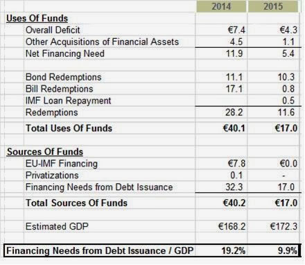 - Os juros e encargos com a dívida previstos no orçamento para este ano são de € 7239 M, contra os efetivos € 7486.1M e € 8189.4M, em 2013 ou 2012, respetivamente. Admite-se neste exercício que os juros e encargos para os anos que se seguem incidirão, de modo proporcional ao previsto para o ano em curso sobre a dívida remanescente, após os pagamentos que incorporam as hipóteses consideradas. Isso significa que se toma como constante a dívida de curto prazo, não considerada no plano governamental de amortizações mas, cujos juros estão, naturalmente incluídos nos números acima referidos.