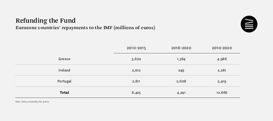 O envolvimento do FMI nos programas de resgate para a Grécia, Irlanda e Portugal já custou aos contribuintes nos países cerca de 9 bilhões em sobrecargas. Enquanto você não pode reverter esse erro, ele pode ser corrigido. Se a situação é tratada com rapidez suficiente, cerca de 4 bilhões de Euros se poderiam ser salvas.