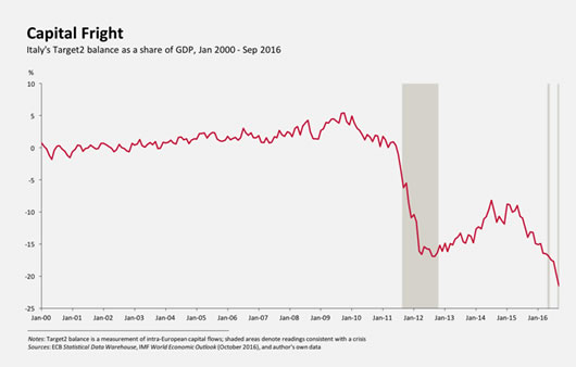 Mas, apesar de toda a conversa de uma crise bancária se aproximando, a crise da balança de pagamentos já está em curso na Itália desde o primeiro semestre de 2016 é o principal factor da conclusão da pesquisa feita em tempo real dos investidores. Antes da adopção do euro, uma posição insustentável da balança de pagamentos na Itália (como em outros países com suas próprias moedas) que normalmente estimulam o banco central a elevar os juros, tornando activos financeiros domésticos mais atraente para os investidores e, decorrentes fuga de capitais. Com o Banco Central Europeu definição da política monetária para a zona euro como um todo, isso não é mais uma opção para a Banca d'Italia.