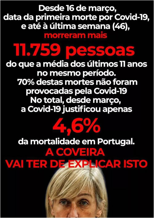 “Desde 16 de março, data da primeira morte por Covid-19 até à última semana (46) morreram mais 11.759 pessoas do que na média dos 11 últimos anos no mesmo período”, lê-se numa publicação que circula nas redes sociais. “No total, desde março, a Covid-19 justificou apenas 4,6% da mortalidade em Portugal”.