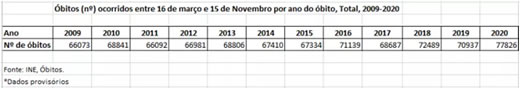 Desta forma, é correto afirmar que apenas 4% das mortes registadas entre 16 de março e 15 de novembro tiveram como causa a Covid-19, ainda que a diferença de óbitos entre a média dos últimos 11 anos no mesmo período e os registados este ano é menor do que a indicada na publicação.