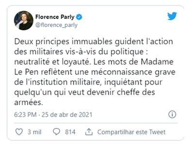 Por sua vez, a ministra da tutela das Forças Armadas, Florence Parly, escreveu no Twitter: “Dois princípios imutáveis norteiam a ação dos militares no que diz respeito à política: neutralidade e lealdade”.