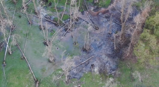 Augusto chegou a acompanhar os investigadores de madrugada e a indicar os locais onde se podiam observar as descargas. Foi precisamente o que fez com a SÁBADO. As imagens captadas a partir do exterior da herdade, permitiram ver várias lagoas dentro da herdade com águas escuras e uma zona de eucaliptal devastada. “Aqueles eucaliptos que estão ali já muito secos, era onde os camiões vinham e descarregavam lá para dentro e depois tapavam tudo”, diz Augusto. A SÁBADO teve acesso a uma imagem, tirada na herdade, e que chegou ao Serviço de Proteção da Natureza e do Ambiente (Sepna) da GNR, com uma legenda: “Foto da vala com lamas ácidas, com cisterna lá dentro, que depois foi tapada.”