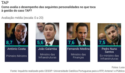 Os inquiridos foram também chamados a avaliar o desempenho de nomes do Governo socialista "no que toca à gestão do caso TAP". O primeiro-ministro vê ser-lhe atribuída uma classificação média de 8,7, numa escala de zero a 20 . António Costa reúne, no total das opiniões expressas pelos inquiridos, 46 por cento de avaliações positivas, ou seja, iguais ou superiores a dez.