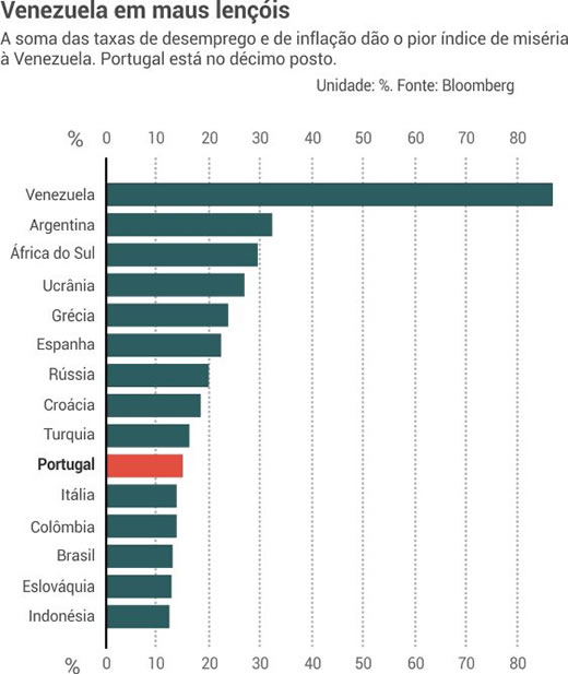 Portugal está entre as dez economias em que será mais “doloroso” viver e trabalhar em 2015, segundo uma lista elaborada pela Bloomberg, que analisa 51 economias mais ricas, num grupo que, em média, tem um produto interno bruto per capita de 31.079 dólares [27.804 euros]. O ranking é liderado, com grande distância, pela Venezuela, e o pódio íntegra, também, a Argentina e a África do Sul.