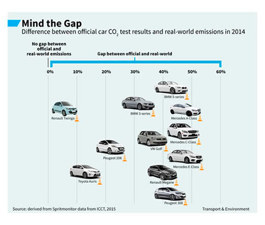 “A média da divergência entre os resultados oficiais e os resultados reais é muito grande. Em geral chega aos 40%. Nalgumas marcas como a Mercedes, essa divergência ronda os 50%. Nalguns modelos desta marca, como os classe A, C e E, o fosso chega aos 55%“, refere Greg Archer.