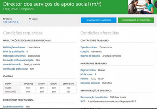 No anúncio salienta-se que o cargo exige experiência mínima de 12 meses e Licenciatura, notando-se que o salário bruto oferecido é de 550 euros por mês - pouco mais do que o valor do ordenado mínimo.