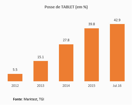 Na 1ª vaga de 2016, o estudo TGI da Marktest contabiliza 3 milhões e 676 mil indivíduos que referem possuir tablet, um número que representa 42.9% do universo composto pelos residentes no Continente com 15 e mais anos.