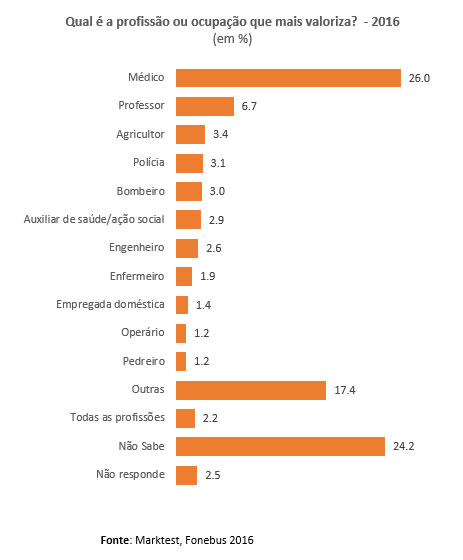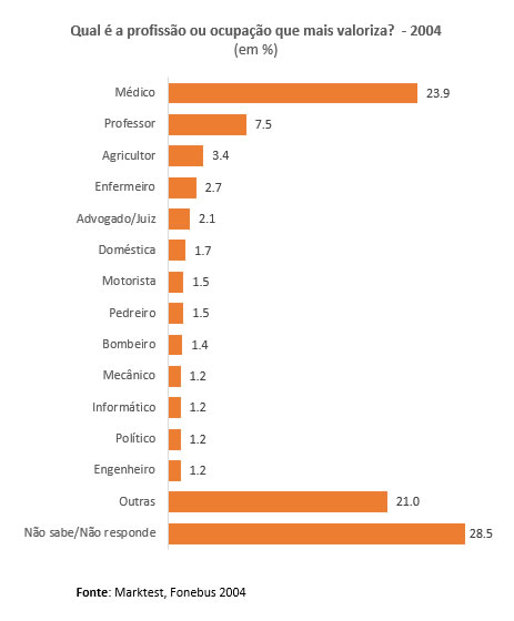 Para 26.0% dos inquiridos na sondagem da Marktest, a profissão de médico é a mais valorizada. A uma distância muito grande surge a de professor em segundo lugar, referida por 6.7% dos inquiridos.