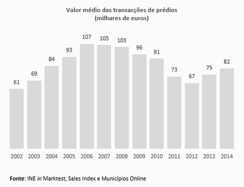 Os prédios transacionados em 2014 tiveram assim um valor médio de 82 mil euros, o valor mais elevado dos últimos 3 anos. Apesar da alteração de tendência nos últimos anos, o valor está ainda aquém do observado em 2010, momento que precedeu a quebra mais significativa do período em análise.