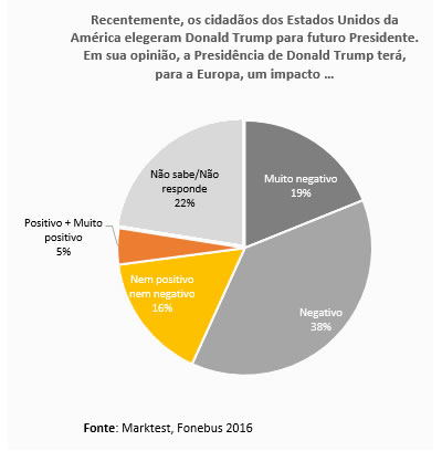 "Recentemente, os cidadãos dos Estados Unidos da América elegeram Donald Trump para futuro Presidente. Em sua opinião, a Presidência de Donald Trump terá, para a Europa, um impacto …". Esta foi a questão que a Marktest colocou aos residentes no Continente com 18 e mais anos.