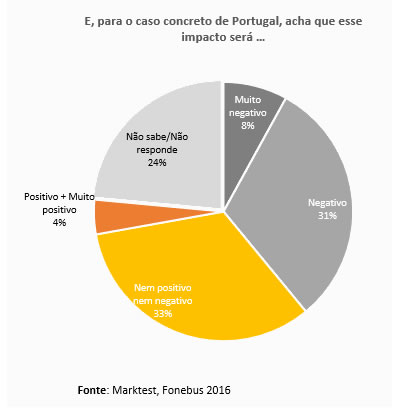 Mais otimismo é revelado quando se coloca a questão "E, para o caso concreto de Portugal, acha que esse impacto será …", embora também as respostas mais frequentes sejam as de que esse impacto será negativo ou muito negativo (39%). Um terço dos inquiridos entende que o impacto para Portugal da presidência de Trump não será nem positivo nem negativo e 23.5% não sabe ou não responde à questão. Apenas 4.3% acredita que esse impacto será positivo ou muito positivo.