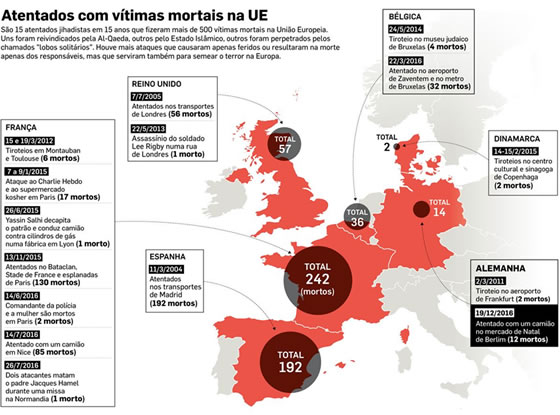 Desde o 11 de setembro já morreram 543 pessoas na Europa vítimas de ataques terroristas com a assinatura do Estado Islâmico, da Al-Qaeda e de outras organizações jihadistas (ver infografia). O mais mortífero foi o de Madrid, a 11 de março de 2004. Dez explosões praticamente simultâneas no interior de vários comboios resultaram em 192 vítimas mortais.