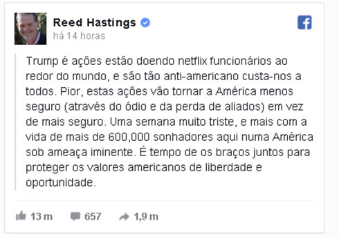 "As medidas de (Donald) Trump afetam os empregados da Netflix em todo o mundo", escreveu no Facebook Reed Hastings, o diretor-geral da Netflix.