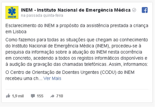 Sobre a situação da criança que sofreu o acidente na ciclovia do Campo Grande, o INEM acabaria por publicar, na sua página de Facebook, um longo esclarecimento, onde dava conta de que "procedeu à pesquisa da informação sobre a atuação do INEM nesta ocorrência em concreto, acedendo a todos os registos informáticos disponíveis e à audição da gravação das chamadas telefónicas".