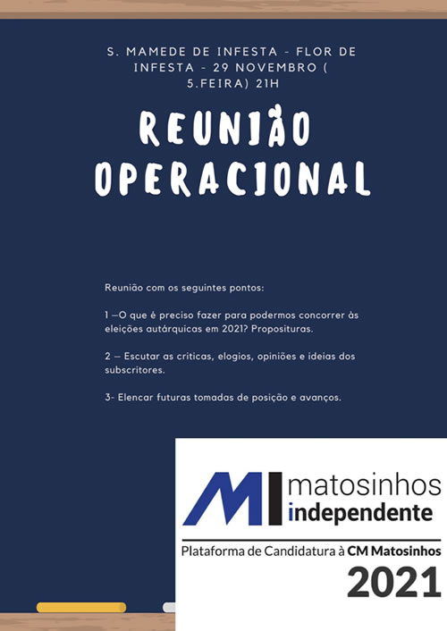 A Plataforma de Candidatura à CM Matosinhos 2021, Matosinhos Independente vai realizar a sua 1.ª reunião operacional, em S. Mamede de Infesta, no Flor de Infesta, dia 29 de Novembro (5.ª feira), às 21h, pelo simbolismo de ser a terra onde nasceu o seu fundador Joaquim Jorge.