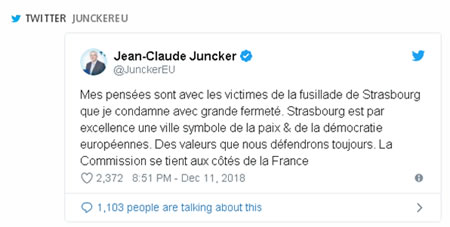 Jean-Claude Juncker, Presidente da Comissão Europeia, condenou o ataque em Estrasburgo no Twitter. “Os meus pêsames estão com as vítimas do tiroteio, que condeno com grande firmeza”, escreve. "Estrasburgo é, por excelência, uma cidade símbolo da paz e da democracia europeias, que defenderemos sempre. A Comissão está ao lado de França", acrescentou Juncker.