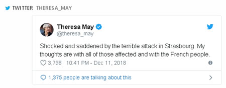 Theresa May, primeira-ministra britânica, escreveu no Twitter estar "chocada e entristecida pelo terrível ataque em Estrasburgo". "Os meus pêsames para todos os afectados e o povo francês", acrescentou.