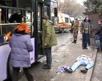 Obus atingiu um autocarro que circulava na cidade, matando pelo menos oito civis. Rebeldes reivindicam controlo do aeroporto.
