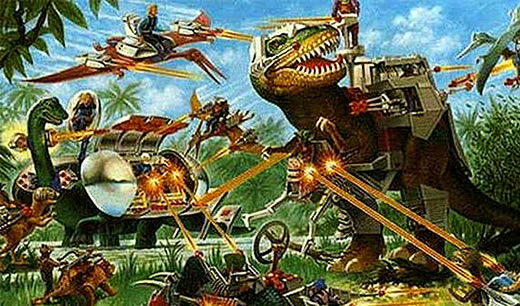 Antes de ‘Jurassic World’ sair do papel, foram vários projetos de continuações bem diferentes para a séri ‘Jurassic Park’. Uma das ideias era fazer uma sequencia onde os dinossauros seriam usados pelos militares como montaria de guerra, funcionando como tanques de combate vivos, armados e blindados com armaduras! Dizem em Hollywood que esse projeto ainda não foi descartado, e quem sabe pode ser a próxima aventura da série. O que você acha: dinossauros “transformers” podem ser uma boa ideia?