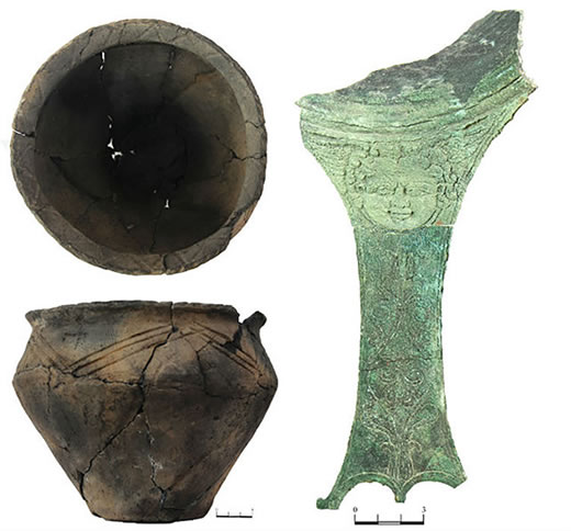 Aos seus pés, havia fragmentos de um recipiente de bronze com ornamentos florais e uma figura semelhante à cabeça de uma Medusa.