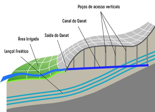 A técnica dos Qanats foi desenvolvida na Pérsia, no milénio I a.C. Essa maravilhosa invenção foi se estendendo a outros países áridos como Marrocos, Argélia, Líbia, Oriente Médio e Afeganistão.