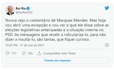 “Nunca vejo o comentário de Marques Mendes. Mas hoje vou abrir uma exceção e vou ver o que ele disse sobre as eleições legislativas antecipadas e a situação interna no PSD. As mensagens que recebi a ridicularizá-lo, para não dizer a insultá-lo, são tantas, que fiquei curioso”, escreveu numa publicação partilhada no Twitter.