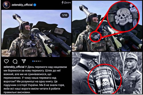 Assinalando, nas suas redes sociais, o Dia da Vitória sobre o nazi-fascismo, Volodymyr Zelesnky partilhou a fotografia de um soldado ucraniano com a insígnia Totenkopf, usada pelas SS entre 1934 e 1945.