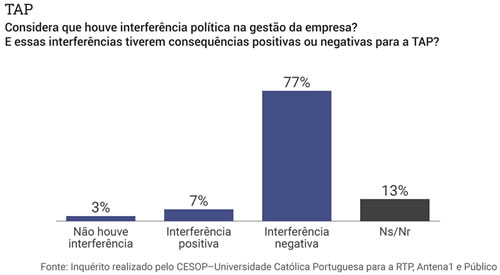 Setenta e sete por cento dos inquiridos para este trabalho do CESOP - Centro de Estudos e Sondagens de Opinião da Universidade Católica, para RTP, Antena 1 e jornal Público, consideram que a transportadora aérea de bandeira sofreu "interferência política na gestão" com consequências negativas.